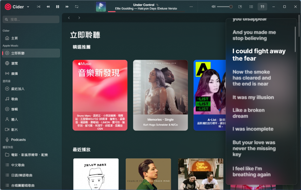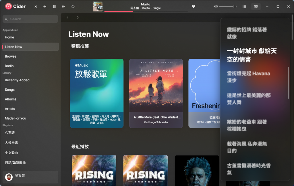 目前 Apple Music 除了 iOS / macOS 和 Android 應用程式版本以外,在包括 iTunes 和 Apple Music 網頁版和大多數的第三方 Apple Music 用戶端中都沒有提供音樂軟體非常重要的「動態歌詞顯示」功能,但「Cider」這款軟體就有提供了,所以對喜歡看歌詞的朋友將會是非常不錯的選擇。