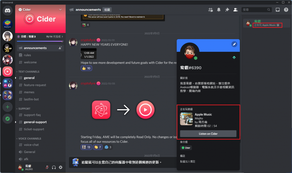 並且還支援 Discord 狀態的顯示,可以讓 Discord 伺服器成員和好友知道你現在正在聽哪一首歌曲,點擊按鈕就會引導到該首歌曲的頁面,就跟你在玩一些電腦遊戲,如 Minecraft 、Apex英雄 或使用 BlueStacks 會顯示目前的遊戲狀態一樣,小細節都有做到位。