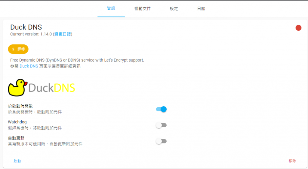 回到 Duck DNS 附加元件的資訊頁面,並啟動。