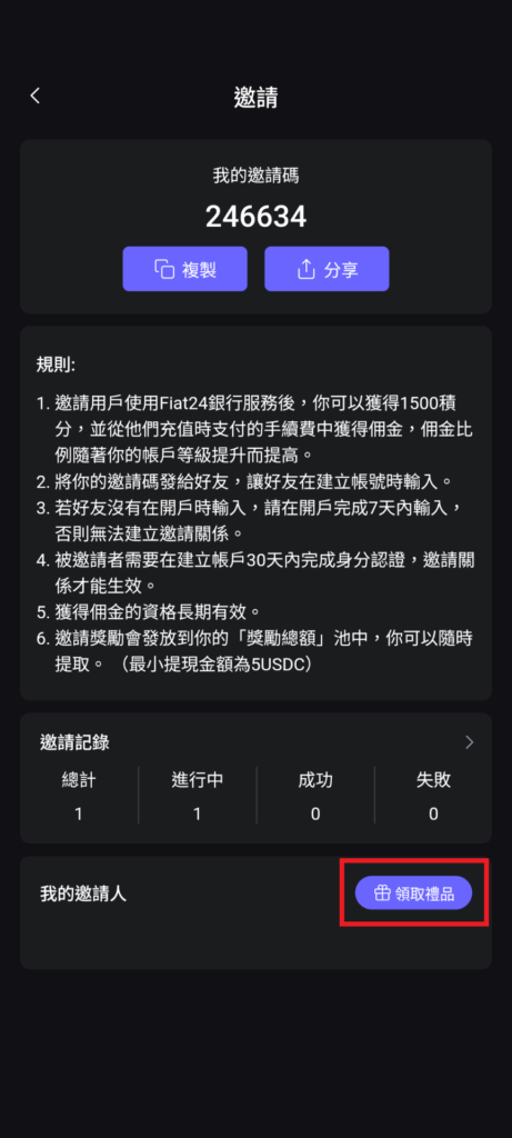 完成 Fiat24 帳號申請後,點擊虛擬 Mastercard 區塊右上角的「邀請」按鈕。