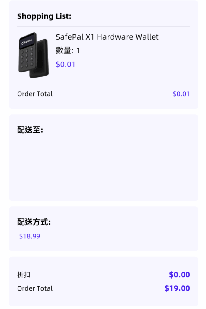 填好你的收件地址後,系統會顯示需要付的運費。目前送到台灣的運費是 19 USDC/USDT,這筆費用可以使用其他等值的幣付款。