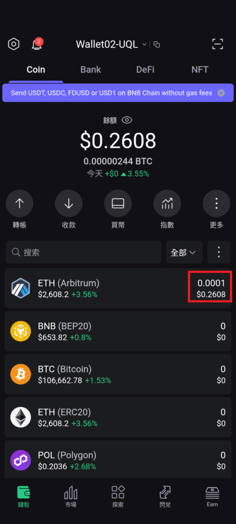 這時候為了防止有人亂申請,需要先往你的 SafePal 錢包裡存入一點點的以太幣(ETH),數量很少,只要 0.0001 ETH(Arbitrum 網路)就可以了。以 2025/06/16 的價格來說,這大約是台幣 8 元左右。