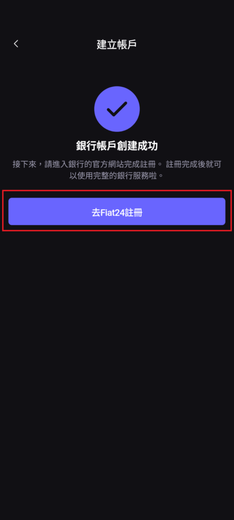 系統建立完成後,畫面會跳出提示,告訴你已成功建立。這時候,請點選「去 Fiat24 註冊」,前往 Fiat24 進行 KYC(身分驗證)流程,完成身分驗證後,Fiat24 帳號才能正式啟用。